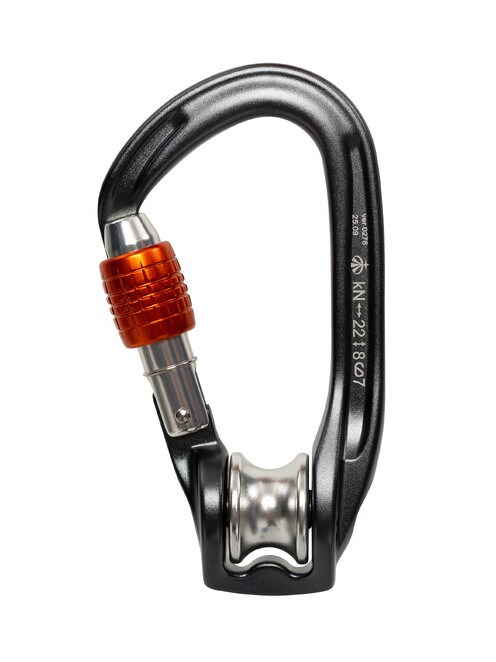 Защёлка карабина открывается с противоположной от ролика стороны для более легкой установки на различные устройства и точки крепления. Тип защелки Keylock облегчает выщелкивание, а винтовая муфта максимально снижает риск самопроизвольного раскрытия карабина. Карабин имеет Н-образный профиль, обеспечивающий оптимальное соотношение массы и прочности.