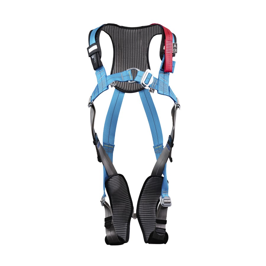 Привязь в комплекте с плечевыми и ножными накладками для комфорта пользователя при длительном использовании при выполнении работ на высоте в опорном пространстве.Асимметричная фронтальная точка с возможностью регулировки по высоте для безопасного подсоединения соединительно-амортизирующей подсистемы.