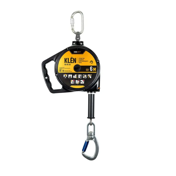 СЗВТ KLЁN относится к компонентам соединительной подсистемы системы обеспечения безопасности работ на высоте (страховочной системы). Представляет собой средство защиты с функцией самоблокировки и автоматическим средством натяжения и возврата втягивающегося троса. Индикатор срабатывания встроен в карабин.